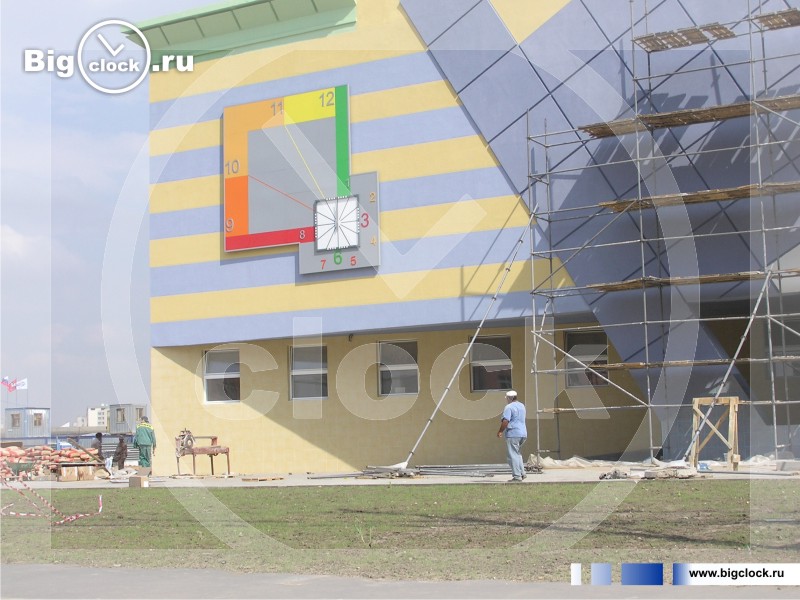 А вот и ещё большие уличные часы. Школьные часы изготовлены из 4 частей. Размер циферблата 1300мм. Размер собранных часов 5х6 м. Крепятся на многосоставной алюминиевой раме. Школьные часы оснащены двухканальной часовой станцией ЕВ – ПИК. Данные часы наружные и в этих школьных часах установлен часовой механизм БЧМ – 1Л разработанный нашим конструкторским бюро, для часов такого класса. Данные часы являются самыми большими школьными часами, когда-либо изготовленными в России. И заметьте, уличные часы стрелочные!