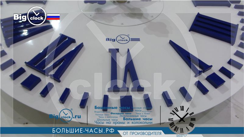 Дизайн подобного изделия идеально подойдет под любой фасад здания и добавит ему свою особую уникальность. Внутри часов был установлен механизм, который славится невероятно тихим и плавным ходом стрелок. Циферблат был изготовлен из композитной панели, знаки объемные и окрашены в синий цвет. Данная модель совершенно не боится любых атмосферных воздействий и может быть установлена в любых регионах России.